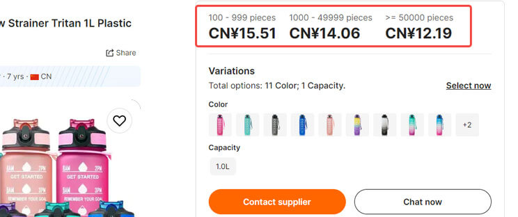 If you only want to buy a few dozen products, it’s better to visit DHgate. Compared to Alibaba and Global Sources, DHgate focuses on small-scale wholesale, with much smaller required MOQs. You can clearly see the corresponding MOQ for various prices on this platform, which is much more friendly to small wholesalers. Here is an example of water bottle wholesale on DHgate for your reference.