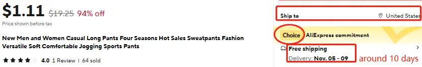 Many people shop on AliExpress because the prices are low and they’re okay with the wait. But if you don’t want to wait, you can pay a bit extra for faster options like AliExpress Standard Shipping or choose to ship from the U.S. You can also look for items marked ‘Choice’—items shipped and handled by AliExpress with faster delivery, around 10 days.